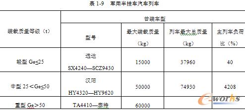 军用半挂汽车列车的编配任务是运载各种工程机械、履带车辆以及坦克和导弹等武器装备。按半挂装载质量Ge的大小可分为轻、中、重三个等级。我军曾编装了轻、中两个级别的半挂列车。远达牌轻型列车主车驱动型式为6×6,半挂车系双轴。汉阳中型列车,主车驱动型式亦为6×6,半挂车系三轴,其它参数见表1-9。