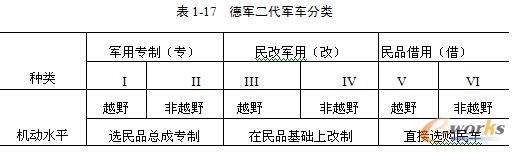 德军算得上是贯彻军车、民车相结合的典范。在它的三代军车中,越野车由一代的80%降为25%,而借用车竟占到了91%,德军将军车分为表1-17中的三种六类,鲜明地体现了军民结合的思想。