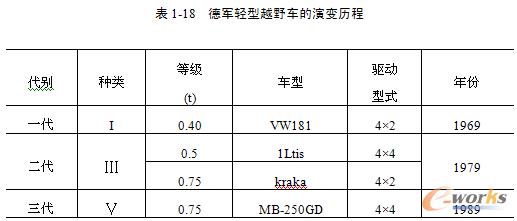 德军第三代军车仍以选用现存的民用产品为主,强调系列化和通用化的水平。各代军车中的轻型越野车经历了一代的专制(Ⅰ类)和二代的改制(Ⅲ类)以及三代的选用(Ⅴ类)的变化历程。参见表1-18。