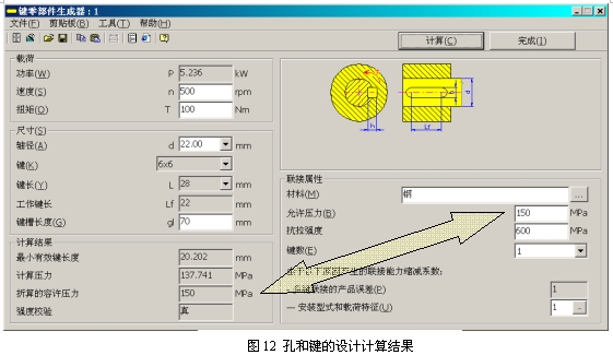 虽然这个结果可用,考虑到图11箭头所指的两个参数的关系,应适当加大键槽和轴的尺寸,于是调整轴径到30mm,以留出足够的安全系数。最后,可创建各种相关的模型,我们现在创建轮孔和键槽,这需要先作草图,之后是插入一个iFeature。