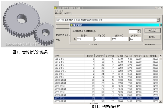 在设计加速器中启用“轴承”设计功能,并将“载荷状态”中按齿轮设计结果输入工况。软件将会推荐最小型号和规格,参见图14。