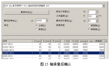 参见图15,对于当前选定轴承的前一个,软件不允许选定,说明这种轴承不能满足现有工况的需要。可见,如果自选轴承的承载能力参数不符合设定要求,将不可能被选定,这就确保不会出错。