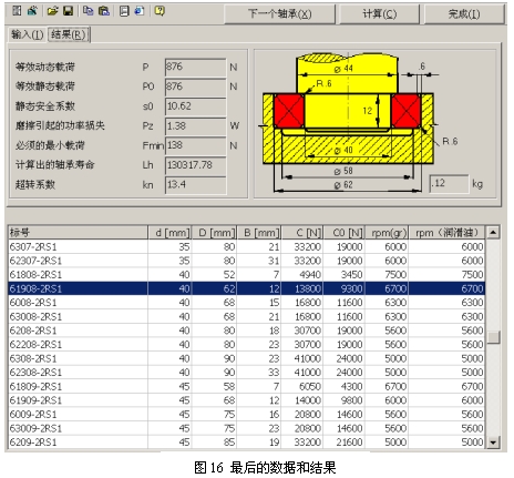 这只是软件认为能够满足工况条件的最小可能的轴承,因为轴承内孔需要与现有轴配合,而目前齿轮轴最小直径是40mm,这就需要将轴承内控直径重新按需要设置,但必须保证已经输入的工况能被满足。