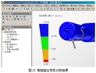 之后添加扭矩,再次分析,得到安全系数(13最小),结果参见图18,符合设计需要。