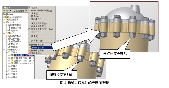 另一个类似的例子,参见02.IAM:总载荷80000N,12个螺钉… 在装配模型创建之后,不仅仅可以调整螺纹连接相关参数和零件选择,而且因为原始零件的尺寸(例如板厚度)造成的螺钉长度的改变,也可以实现自动调整。也就是,当桶体连接部厚度增加后,选定螺钉,并要求“更新螺栓连接”,然后之后螺钉相关件也能在这个型号的现有螺钉长度范围内,自动完成新的螺钉长度选择和模型更新,参见图4。