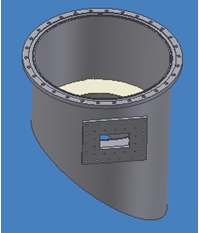 现在我们已经退出草图设计模式而进入钣金特征设计模式中。在钣金特征菜单选取“钣金样式”命令,根据零件厚度及工艺要求在弹出的“钣金样式”界面中将“图纸”、“折弯”及“拐角”选项卡填写完整,也可以采用默认选项,然后选取“保存”及“完成”命令结束钣金样式的设计(图2)。继续在钣金特征菜单中选取“异型板”在异型板界面的“展开选项”及“释压选项”两个选项卡中选取所需方式,在“形状”选项卡中点击“截面轮廓”系统默认为圆弧,在“终止方式”的距离文本框中填上升高座壁的高度1238mm,然后利用“分割”及“剪切”特征完成升高座壁的设计如图3所示,在具体操作过程中要应用到创建轴及工作面、草图的约束,这里不再赘述。