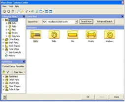 资源中心可以随时被调用。它方便快捷的汇总了工程零件,简化了创建、重用和管理所有公司共用的零部件过程。方便易用的资源中心浏览器提供的搜索和过滤的功能快速查询到正确的零件族。资源中心包含650,000多种零件,如螺栓,螺母和螺钉等。同时,企业或用户可根据需要添加自己需要的零件或标准特征到用户库中。