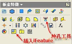 由完成作品的图标来看,使用「插入ifeature」产生一个锁孔,跟使用「冲孔工具」使用一个指令完成5个十字孔的执行效益截然不同,因此使用者得以自行判断使用时机与使用效率的拿捏。