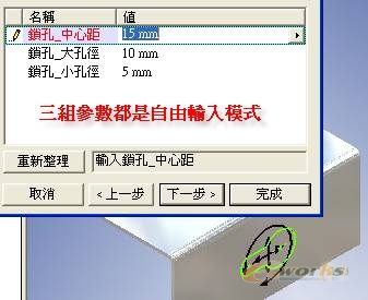 「锁孔.ide」是笔者制作的一个「特征式iFeature」,而其中三组参数都是采「自由输入」模式,所以三个字段都可以随设计需求自由填入适当尺寸,其操作过程与「零件」如出一辙。