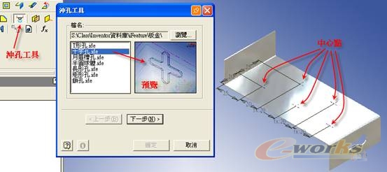 至于「冲孔工具」则是以「点对多点」的模式进行「插入iFeature」,所以笔者预先将多个「中心点」以「草图」模式建立在板金上方平物面上。然后启动「冲孔工具」,Inventor会依据「选项」的路径指向设定前往搜寻可供使用的「冲孔工具」资源。在本例中笔者选定「十字孔.ide」作为演示题材。
