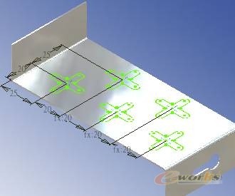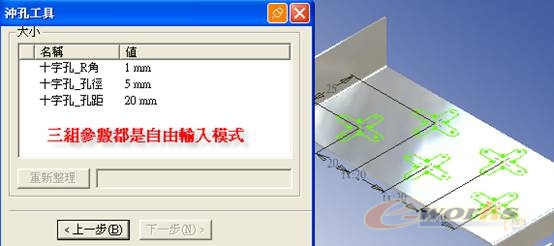 本例中笔者也是提供三组自由输入的参数,填入适当设计尺寸后按下「确定」按钮即可完成冲孔设计。(注:草图中的中心点相对位置是透过「一般标注」及「水平」几何限制」所完成,其结果跟「特征数组」不尽相同)