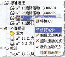 同理修改起停式曲柄飞剪机构中出现连接错误的接点,建议读者使用软件自带的“修复冗余”命令解决类似问题,如图8所示。对于较简单的动力学模型,在“修复冗余”命令菜单中可以直接对其进行修改,而对于复杂的动力学模型,此处只能提出合理化建议,设计人员需要使用“插入连接”的命令,重新定义连接关系,如图9所示。