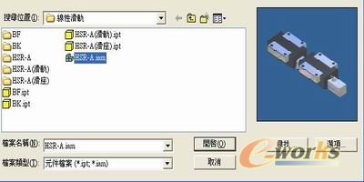 现在笔者将开起一张新的组合图,并插入两组组合内容、型号相同的HSR-A机构组合,但是在以下的演示中,笔者将会尝试在零件号码不变的情况下,把滑座的相对组装位置做不同的调适以符合多变的设计环境。 跟一般的作业程序一样,在组合环境下使用「置入构件」插入一个次组合。