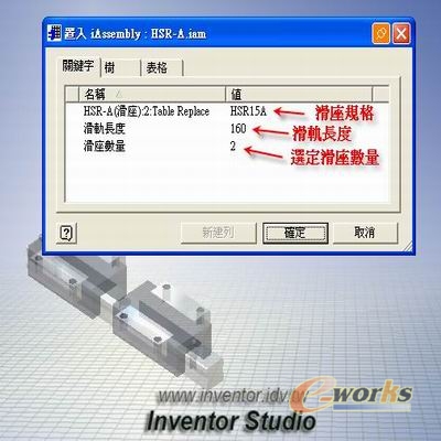 接下来看到的操作模式跟插入一个iPart一样,笔者已经设定成三项选单筛选式,使用者只要选择适当的滑座、滑轨长度及滑座数量等3种条件的组配即可。