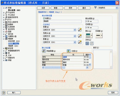 ●回到“样式和标准编辑器”主窗口,如图(8)所示。可以看到“默认列设置”内已经按刚才的设置发生了相应的变化。接下来对列表头和列宽进行设置,其依据为所要创建的明细表的列表头和列宽,如表(1)所示。