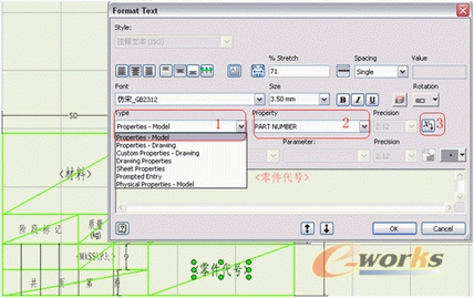 a)选中刚才建立的标题栏“test”,右键“编辑(Edit)”,选取“文字”工具,点击图5中序号4处,出现如图6所示对话框,在红色标示1中,选择继承的类型(模型特性、工程图特性等),在红色标示2中选择属性的关键字(作者、零件代号、材料等),然后点击标示3,“OK”。