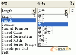 指定搜索范围。高级搜索实质是个多目搜索,有“基本”和“高级”两目构成。“基本”则由名称、描述、零件代号、标准和材料构成。“高级”则由参数条件关系列表构成,参数条件关系定义如图9所示。