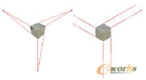 在“透视照相机”模式下,零件或部件模型均以三点透视方式显示,显示出的直观效果为平行线会聚于没影点。这是人眼或照相机感知真实对象的方式。