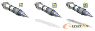 使用其中一个“更改显示”工具可以在以下三种显示模式之间切换:“着色显示”模式、“隐藏边显示”模式和“线框显示”模式。显示模式可应用于零件和部件模型以及工程师记事本中的视图。