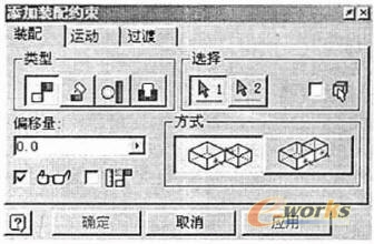 配合: 主要用于平面、直线、点之间的重合或平行等的约束。在配合窗体的右下方有朝向相反和朝向相同两个命令。选定要配合的两个零件,选定两个零件上的平商,根据实际情况,选用两面朝向相反、两面朝向相同,可以是零间距贴合,可以有间隙。
