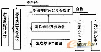 如图5所示,在零件造型完成一部分后,可对有些部件进行装配,即二者同时进行,对部件装配检查合格的接下来做爆炸图和生成部件二维图等工作,不合格的转到零件造型里面进行修改;零件二维图的生成也可以与部件装配同时进行,具体的安排要根据实际情况适当调整。
