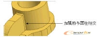 10 单击“圆角”,然后在零件顶部加强筋与圆柱相交处选择三条边。将半径改为2 mm,然后单击“确定”。