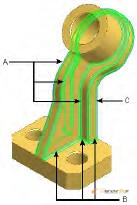 13 在“圆角”对话框中,选择“选择模式”部分中的“回路”选项。选择基座上零件后向边的任意位置 (C)。请注意“回路”选项如何自动选择其他边。