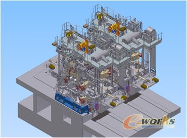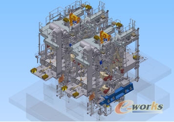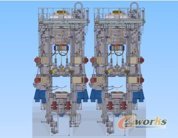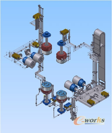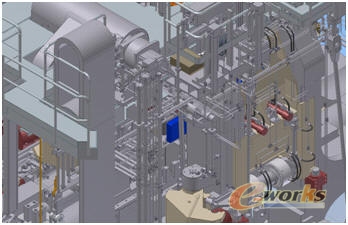 图中所示为AGC油缸的控制管路系统。每一套油缸都配有一个控制阀块,和一套独立的管路系统。在设计中,阀块到油缸之间的管路要尽量短,以提高控制系统的响应特性。INVENTOR的使用,使机械本体设备一目了然,可以使阀台的布置最优化,在提高设计效率的同时也使设计质量有了很大的提高。