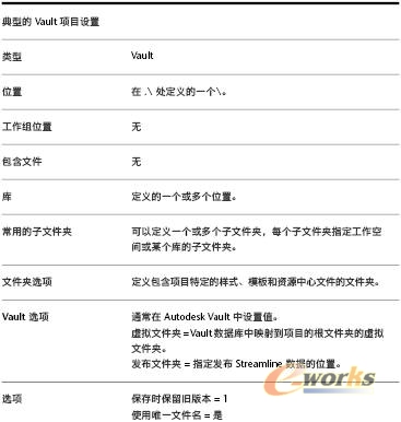 要使用 Vault 项目,必须安装 Autodesk Vault 软件。将打开其他对话框,以便可以创建 Vault 项目。 Vault 项目的特征包括: