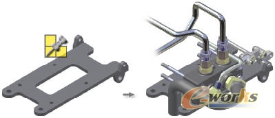 在部件中装入第一个零部件时,需要选择基础零件或子部件(如结构件或底盘)。除了第一个装入的零部件以外,所有装入的零部件均未被约束和固定。可以根据需要添加约束。
