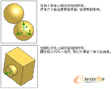 约束可能会限制零件的运动。根据几何图元的不同,自由度被删除或受到限制。例如,如果在两个球体间应用相切约束,则六个自由度将全部保留,但是不能仅朝一个方向平移其中任何一个球体。