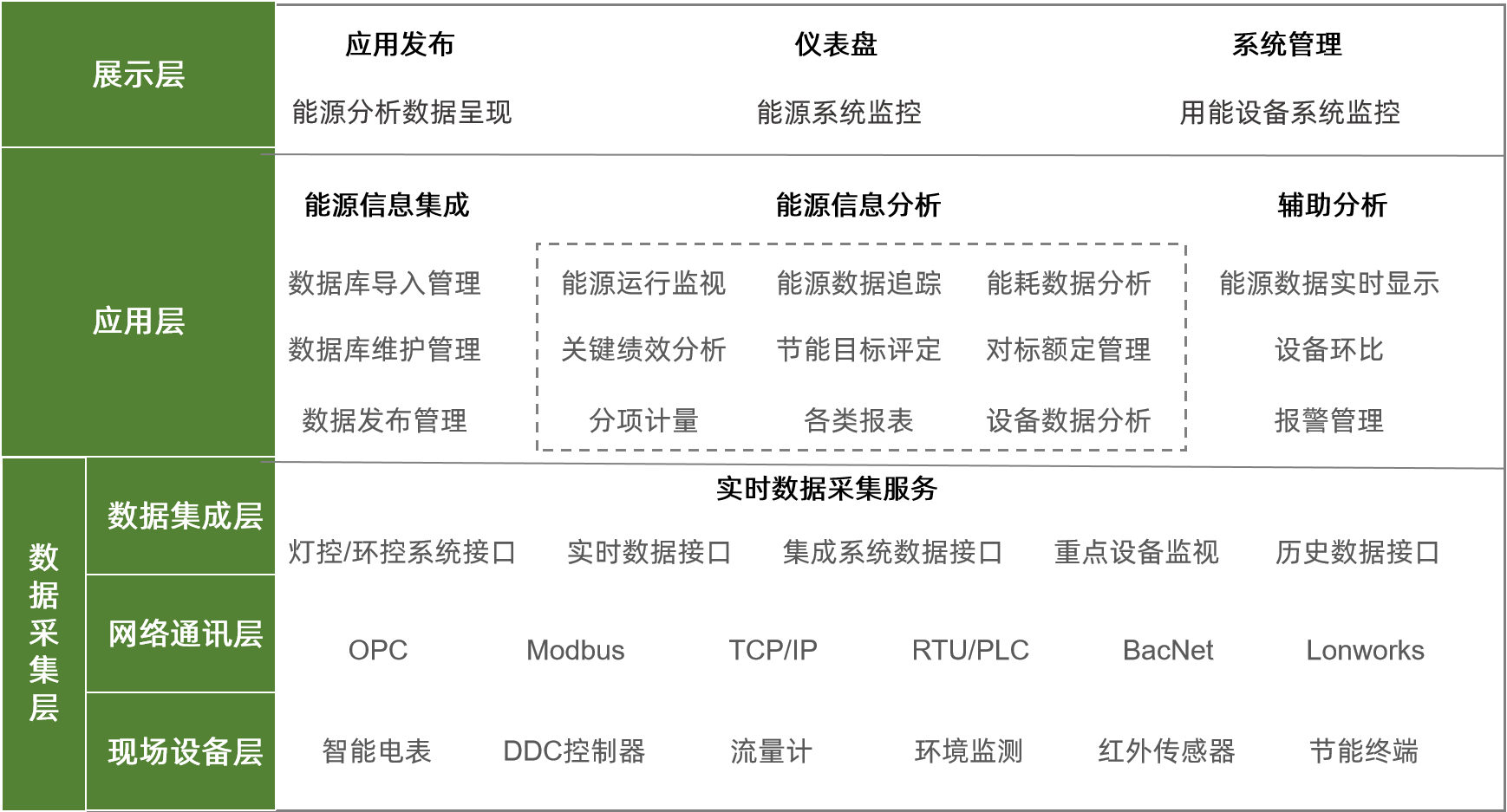 EMS解决方案通常涵盖数据采集、分析、预测、调度、控制、管理等功能。从系统的架构层级来看,EMS自下而上分别为:数据采集层、应用层和展示层。其中,数据采集层运用各类传感器、测量计等自动采集能源数据,奠定了能源数字化管理的基础;应用层主要用于分析能源信息,通过对能源运行情况进行多维度分析,实现能源使用的监测、统计、对标分析、预测与优化等;展示层则是将能源运行情况利用多样化图表展示,更直观地呈现能耗的数值、趋势和分布等,帮助管理者快速洞察能源利用状态,并能针对异常迅速采取纠正措施,提高能源利用的效率。