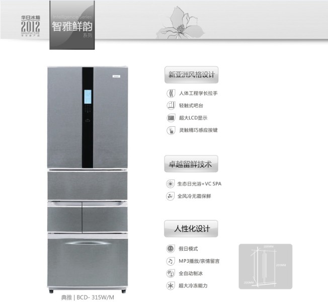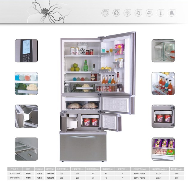 产品采用风直冷制冷循环系统,有效地解决了全风冷电冰箱产品在冷风循环中将保存食物的水分带走从而影响食品新鲜度的问题