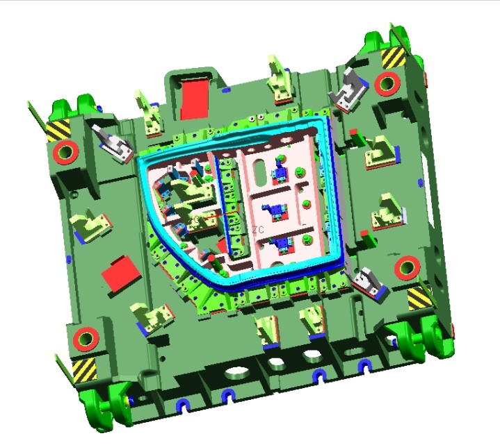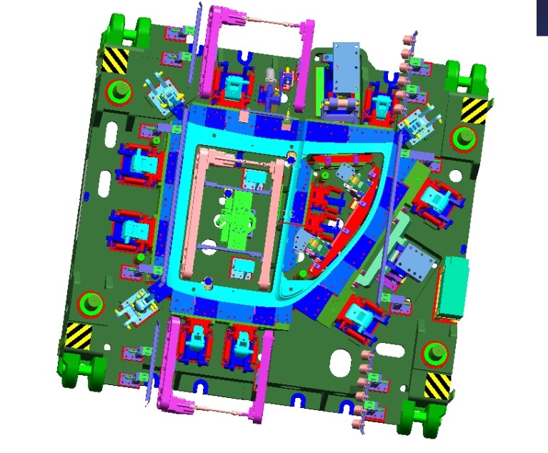 1、这是一套周圈和窗口内圈同序完成的复杂模具,特别是窗口内部的多边自压合,工作内容多,机构复杂,机构运动关系复杂,然而空间又非常紧张.
