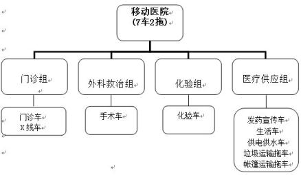 移动医院由9台相关功能的特种车辆,组成4个组所构成。这4个组分别是:门诊组、外科救治组、化验组、医疗供应组。共7辆特种车辆和2辆拖挂车辆。