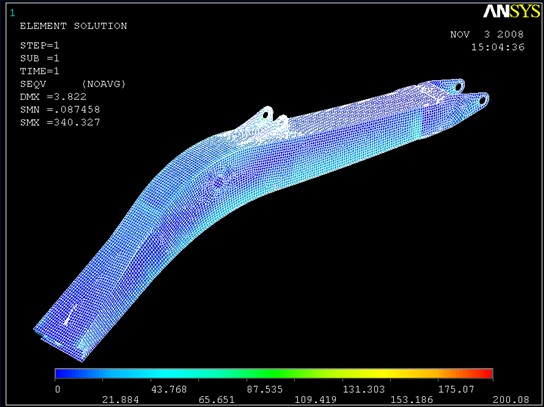相当不错啊,所有大型结构件和关键零部件全部使用最先进的cae分析软件ansys进行有限元分析。如:动臂进行了有限无分析,采用大横截