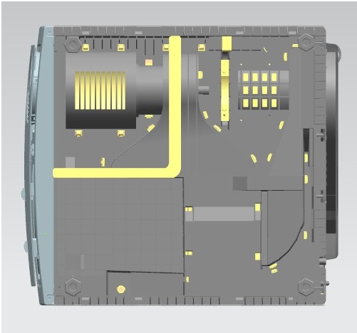 第一点:底座成一整体,后风道上下两部分热熔连接,使整个底座风道系统成一整体,避免因热熔的工艺不稳定性造成箱体整体尺寸不稳定,提高零件间组装后的密封性。