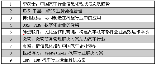 本次峰会以汽车产业信息化为核心,涵盖了汽车行业信息化建设的各个环节,邀请到IDS SCHEER、神州数码管理系统有限公司、UGS、ESG、微软中国、金蝶软件、美国世纪博方、IBM等国内外领导厂商的总裁和资深人士,结合国际汽车行业信息化的发展趋势和最新技术研究,分别从技术创新、管理创新和方法创新等角度,介绍了汽车行业信息化所涉及的研发、制造、供应链管理、电子商务等方面的优秀解决方案,发表了各自的看法和见解。