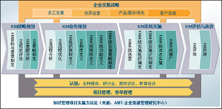 身处异乡的人,在陌生的环境中如果没有地图,简直寸步难行。变革对企业而言,恰如“异乡”之痛——前面会有什么困难?还要走多远?能最终到达目的地吗?最糟糕的莫过于迷失在变革的迷宫中。此时,方法论“地图”成为获救的法宝——人们常常并不是畏惧改变,而是害怕未知。 知识管理项目牵涉到组织中的人、过程以及技术等方方面面的变革,诸如如何激励共享知识的文化?如何理顺知识生产的过程?如何配置合适的技术系统?为了保证知识管理项目的顺利实施,在实施项目之前,首先还得画幅“地图”——建立知识管理实施方法论,既帮助企业从大处着眼规划未来,又脚踏实地地从小处入手协助员工进行知识管理工作。 为了画好这幅“地图”,需要做好以下工作:首先,要认识到知识管理项目的变革本质;其次,要描绘出这幅“地图”的总体框架,更关键的是要标出“地图”上的要点,多个要点相连就构成了这幅“地图”的核心路径。 变革过程 在实际应用中,知识管理项目常常是多种类型的交叉和整合。从决策意义上来看,知识管理项目也注定要整合不同类型、不同层次的知识(图1)。企业IT建设所形成的数据和信息的汪洋大海,增大了企业决策的复杂度。这样,相应地要求企业增强不同层次的决策能力——从个人的知识能力到组织的协作能力,以及整体的前瞻性、战略决策能力等等。这些能力都离不开对知识的整合和管理。具体来说,个人知识创新能力通常需要进行个人知识管理才能得以提高,而组织知识管理则可以提高组织的知识协作能力,企业的战略决策能力也离不开对组织外知识的管理,如需要集成客户、供应商、合作伙伴等的外部知识。  图1不同类型知识管理的整合 知识管理项目不只是一个技术项目,它在本质上是企业的变革过程。彼得·圣吉认为,为了保持变革的持续进行,至少有三种通过相互依存关系而存在的变革强化方法,即强化个人成果、建立有责任感的员工网络以及改善企业业绩(图2)。对变革创新的投入产生出了新的学习能力和个人成就(R1);通过非正式的关系网,使参与和了解的人越来越多(R2);最后学习能力产生出新的企业方式、企业成果并增加了信誉(R3)。所有这些都使人们越来越愿意投身于变革活动,于是投入的程度就不断加深。  图2深层次变革的成长过程(来源:彼得.圣吉) 同样,为了保证知识管理项目的顺利实施,也必须至少能够在上述三个方面取得进展,如通过知识交流和共享提高个人学习能力、通过试点成功而获得示范效应、通过取得直接的经济绩效而增强信心。那么怎样才能取得这些成果?如何知道取得了这些成果呢?所有这些并不只是安装一套系统让大家用就可以了,问题远没有这般简单。 “地图”要点 项目实施方法论的关键,是要反映出在战略规划、业务规划、系统实施以及评估与改进等方面系统性的指导意见,并能够将成熟的项目管理、变革管理贯穿始终。 目前,不同的公司在导入知识管理项目时通常会遵循不同的流程。一般而言,知识管理项目实施方法论包括三个层面,即战略层面、实施层面以及保障层面(图3)。 图3知识管理项目实施方法论 就像一幅地图总有要塞也有小城,既有骨干大道又有旁支小路一样,知识管理项目实施方法论这幅“地图”也有要点。认清并掌握这些要点,我们就可以更有效地确保知识管理项目的顺利实施。那么,在这幅“地图”上,到底有哪些值得特别注意的要点呢? 对一个具体的知识管理实践来说,通常要从企业战略的高度出发,将知识管理战略和业务战略紧密融合。那么为了实现这种融合,就需要知识管理战略融合模型——这是“地图”上的第一个要点。 在此基础上,需要对企业的知识管理现状进行认识,如进行现状调查和分析、确定其成熟度、归纳相关需求等。为达到这个目的,我们需要有一个知识管理诊断模型,这是第二个要点。 有了整体的战略融合模型,又有了诊断模型,这样就可以有针对性地设计企业知识管理项目导入的策略。如确定什么样的知识管理目标?是一次性全面导入还是渐进导入?是偏于对系统的管理还是偏于人的管理?这些都是第三个要点——知识管理策略模型所要考虑的问题。 在确定了知识管理策略的基础上,还需要规范、明晰、阶段化的知识管理实施路径,这构成了“地图”的第四个要点——知识管理路径模型。 为了保证知识管理路径能够畅通,还需要有一种机制去定性或定量地测量知识管理在实施路径的各个阶段所取得的成果,并对实施形成反馈和调节。这就是第五个要点——知识管理测度模型。 这样,五个要点、五种模型构成了知识管理实施方法论的关键路径。在具体实践中,需要将它们有机整合起来,具体来讲,就是“以战略融合为出发点,从认知开始,沿知识管理实施路径,用策略推进,以测度反馈,最终实现从现状(ASIS)到未来(TOBE)的转变”。 知识管理不神秘