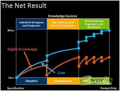 我们看下面的两条曲线,红色代表数字化技术的传承,蓝色代表成本。当设计数据从一个部门向另外一个部门迁移的时候,我们看到知识在这里被中断,导致丢失很多的知识和数据,对应的成本就会上升。制造阶段,这个锯齿状的曲线,意味着这个时期制造的过程中会有更多的物理样机的出现。非数字化的变更、修改,都会导致成本大幅度的上升。