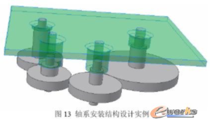 现在以一个典型的轴系安装结构为例,参见图13,其中包括了4个齿轮的啮合关系、中心距要求等工程关系,已经有了4个齿轮轴的模型。