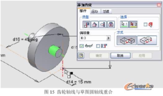 2. 开始新装配,引入4个齿轮和002-Base.IPT,将齿轮依照草图装配好,例如图15的实例,先选定齿轮轴线,再将光标在草图圆附近移动,注意查看,当Inventor感应到草图圆,并显示推理得出的轴线,拾取。