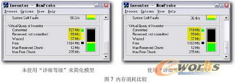 我们依然可以比较是否使用“详细等级”来简化子装配对资源的消耗。“手压机.iam”是完全模型,而“手压机b.iam”是抑制了部分零件的模型。分别调入新建的装配中,使用Memprob查看两种情况对内存的消耗,结果参见图7。