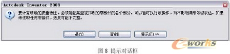 使用这种方法并不会改变子装配的物理特性。只是会在你查看此模型物理特性的时候,会弹出如图8所示的提示框,让您加载一次那些被抑制的零件。当然一旦加载了那些别抑制的零件,那些节省的内存又会被占用了。所以如果一旦查看了物理特性,这种轻量化的方法就失效了。