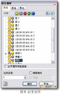 3. 这时会弹出“衍生部件”对话框。为了能更好的减少资源的消耗,可以在对话框中选择不需要带入到总装配的零件,参见图9。“确定”返回到模型环境。