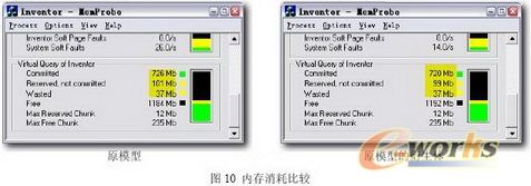 为了证明这种方法能够减少内存的消耗,我们可以作如下测试,就是先后各新建一个装配,分别将“手压机.iam”和“手压机_衍生.ipt”装入各自的装配中,通过Memprob显示的数据来比较这两种情况对内存的消耗。测试的结果见图10。