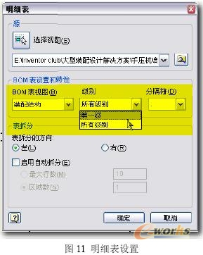 其次,在工程图方面,子装配的工程图不会改变,而总装配的工程图有一些变化。正如前面所说的,衍生体的iProperties与原子装配的不能关联,而在总装配明细表中的子装配(衍生体)的特性是不会随原子装配改变而改变的。正常情况下,将原子装配装入总装配中,在BOM表和明细表中可以显示子装配下的各个零件(参见图11)。而将衍生体装入总装配中,却做不到这一点,毕竟它只是一个零件。对于这一点来说,影响并不是很大,因为在大多数总装配工程图中,我们并不会把子装配的零件标识出来。
