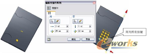 3. 利用装配约束在装配环境中将按键“安装”在外壳上,并调整按键的位置、形状、大小等,达到最佳效果。在装配环境下,通过阵列功能阵列出其它的按键,如图3.2所示。保存。