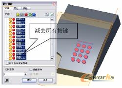 根据按键的形状和排列,设计出电话机的面板上按键孔。我们可以先将按键“安装”在外壳上,调整其位置达到最佳效果,然后再在外壳上“减去”按键作出孔,得到外壳零件。可能在设计后期当需要更改按键的形状和排列时,电话底座上的按键孔也会相应的更改。