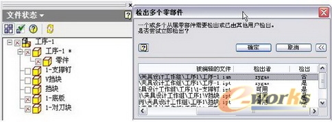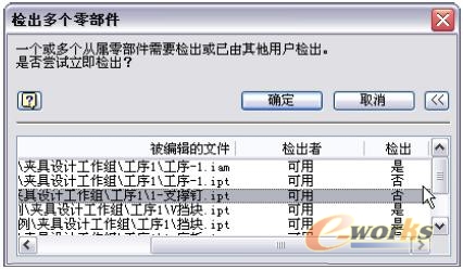 在这里需要注意的是,如果服务器上一部分文件已经被其他用户检出,在该文件前面就会出现相应的标记。此时如果选择检出树,所有的文件状态依然均为“是”,我们在这里要提醒用户的是,对于不是设计该零件的负责人,请务必将检出状态改为“否”。因为如果这样操作后,该文件就会被强制检出,导致之前检出该文件的用户无法检入他设计的新版本文件。